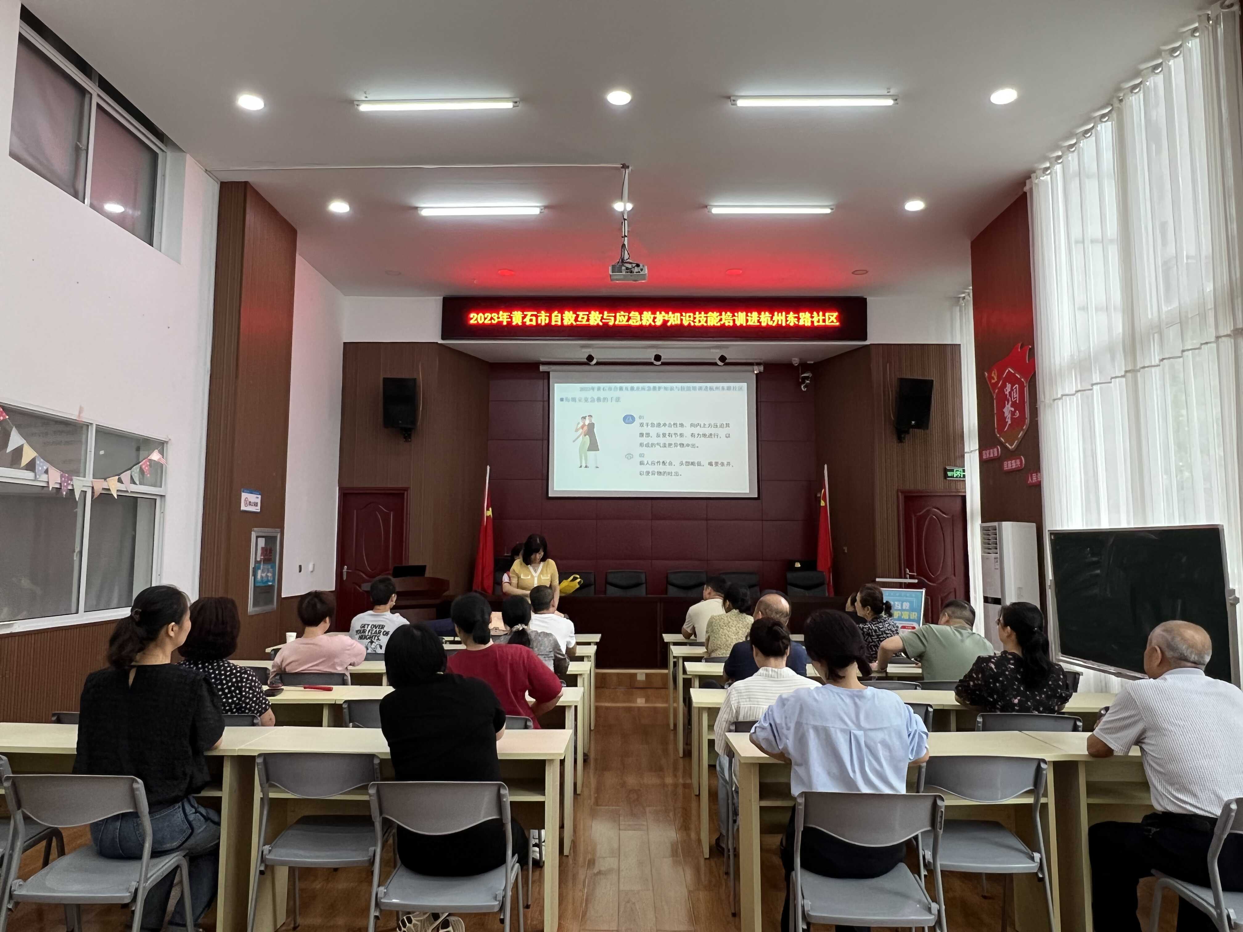 “大家可以用‘剪刀--石头--布’的口诀记住海姆立克急救法的操作手法:剪刀,就是两个手指并拢,像一个闭合的剪刀,首先是找到患者肚脐的位置,然后将两根并拢的手指横放在肚脐以上,即可找到按压点;石头,一手握拳,拇指侧的拳眼放在按压点上;布,指的是另一只手抱拳,然后用向上、向内的力量,冲击患者的上腹部。”2023年9月14下午,黄石市应急管理局志愿者到下陆区杭州东路社区对居民进行“海姆立克急救法”知识培训,为居民送上了一场贴近生活、行之有效的急救知识大餐。